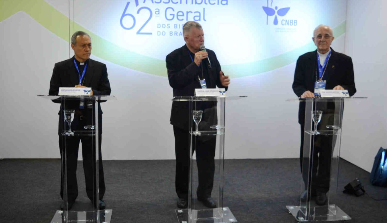 A primeira coletiva de imprensa da 62ª Assembleia Geral da Conferência Nacional dos Bispos do Brasil (AG CNBB) foi realizada na manhã desta terça-feira, 15 de abril, no Centro de Eventos Padre Víctor Coelho de Almeida, no Santuário Nacional de Aparecida, em Aparecida, São Paulo. Participaram da atividade o presidente da CNBB, dom Jaime Spengler; o secretário-geral do Conselho Episcopal Latino-Americano, dom Lizardo Herrera; e o bispo emérito da diocese de Livramento de Nossa Senhora, na Bahia, e diretor espiritual do Colégio Pio Brasileiro, em Roma, dom Armando Bucciol.