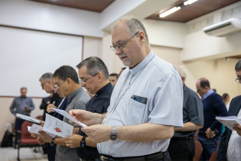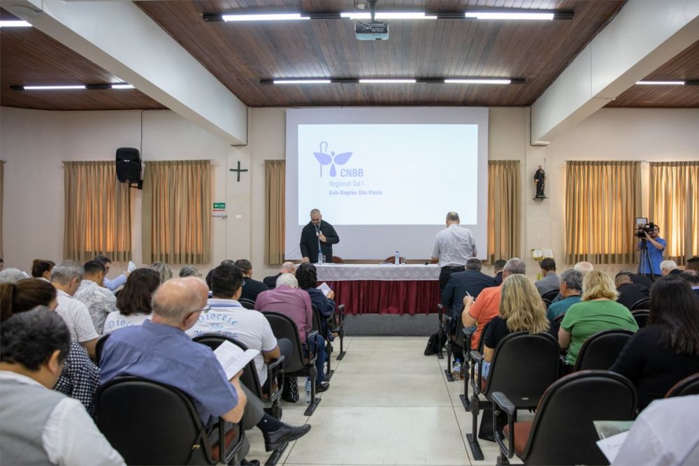 O secretário do Sub-Regional São Paulo, Pe. Joaquim Camargo, da Diocese de Santo Amaro, acolheu os participantes com a oração inicial, ao seu lado, Dom José Negri, bispo da Diocese de Santo Amaro.