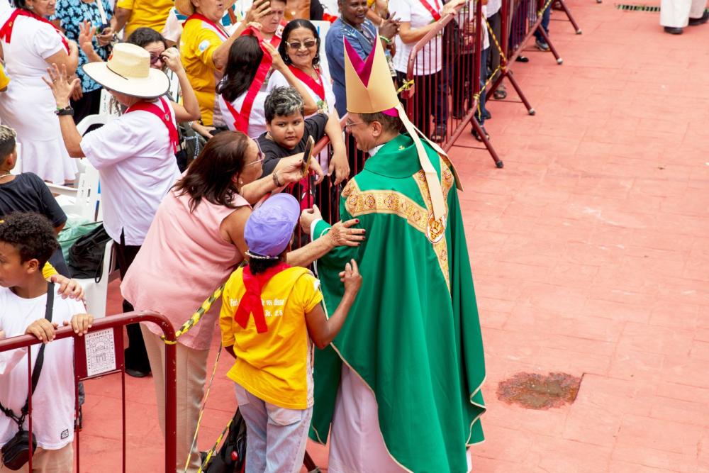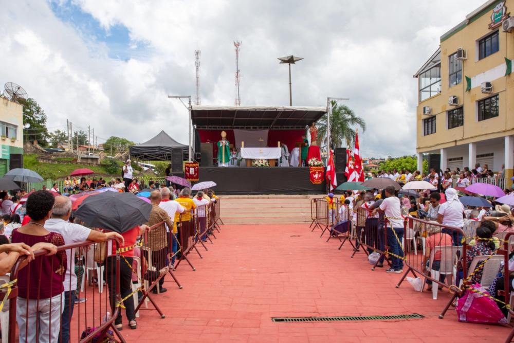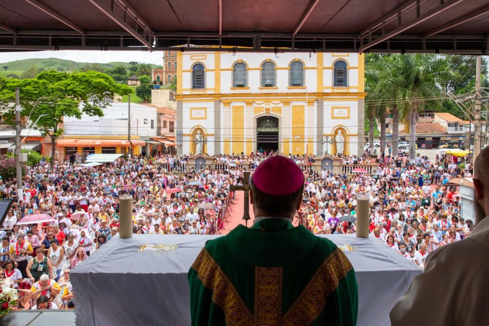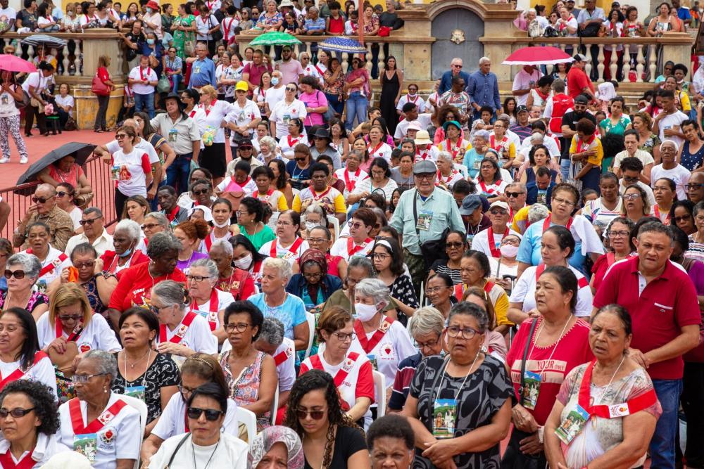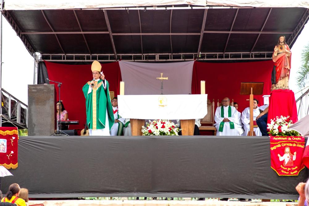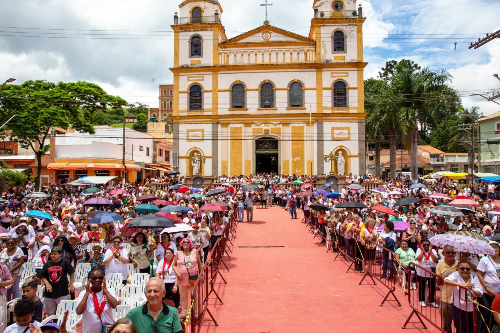 Já às 9h30 da manhã, havia uma grande movimentação na praça em frente ao santuário de homens e mulheres do apostolado com suas camisetas e fitas características. Um altar para a celebração é montado em frente à igreja, que em seu interior não comporta tantas pessoas. O Apostolado da Oração é uma rede mundial de oração a serviço dos desafios da humanidade e da missão da Igreja, expressos mensalmente nas intenções mensais de oração do Papa.