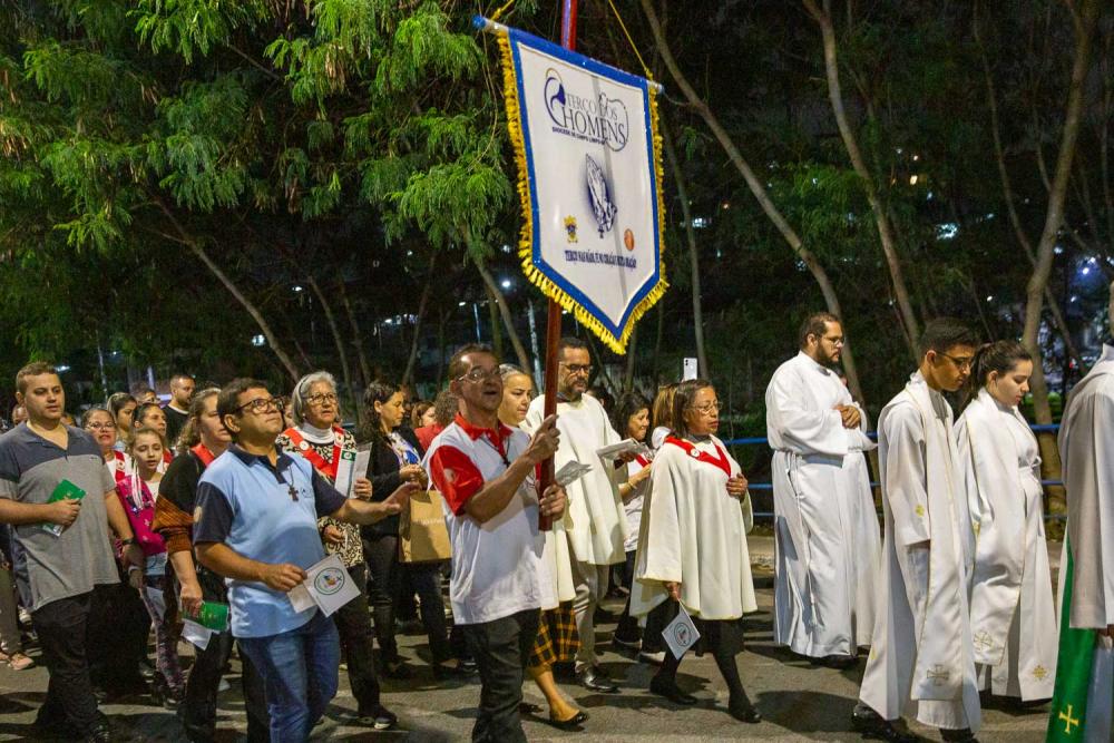 A peregrinação seguiu para a Catedral Sagrada Família, conduzida por cantos e salmos que fortaleciam o clima de oração e unidade. A celebração eucarística, presidida por Dom Valdir e concelebrada por Padre José Clodoaldo Ferreira Rodrigues, assessor das Associações e Movimentos, foi marcada por uma homilia atual e provocadora.