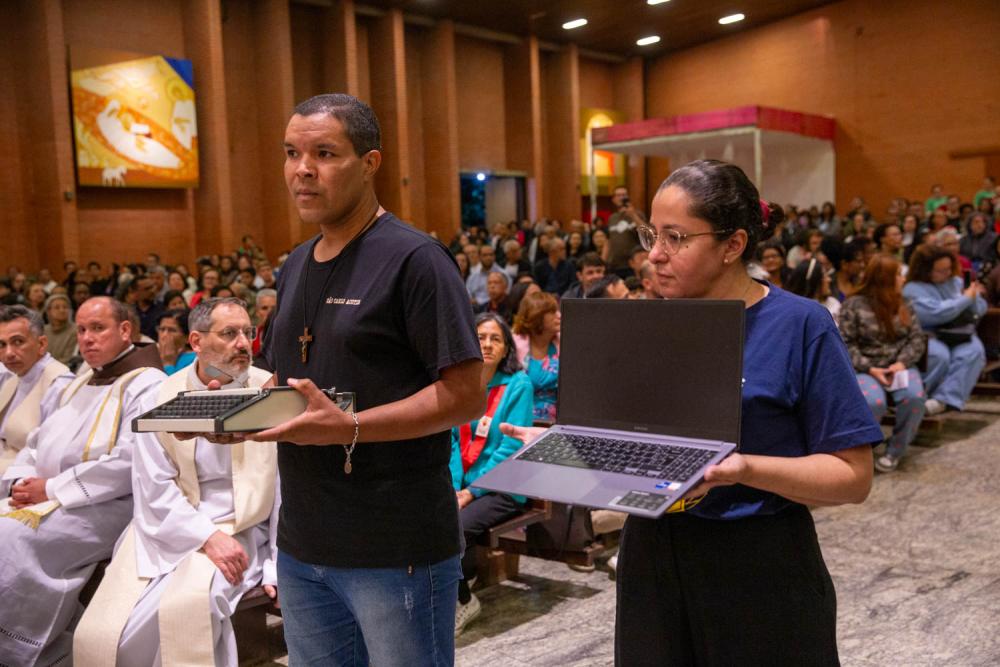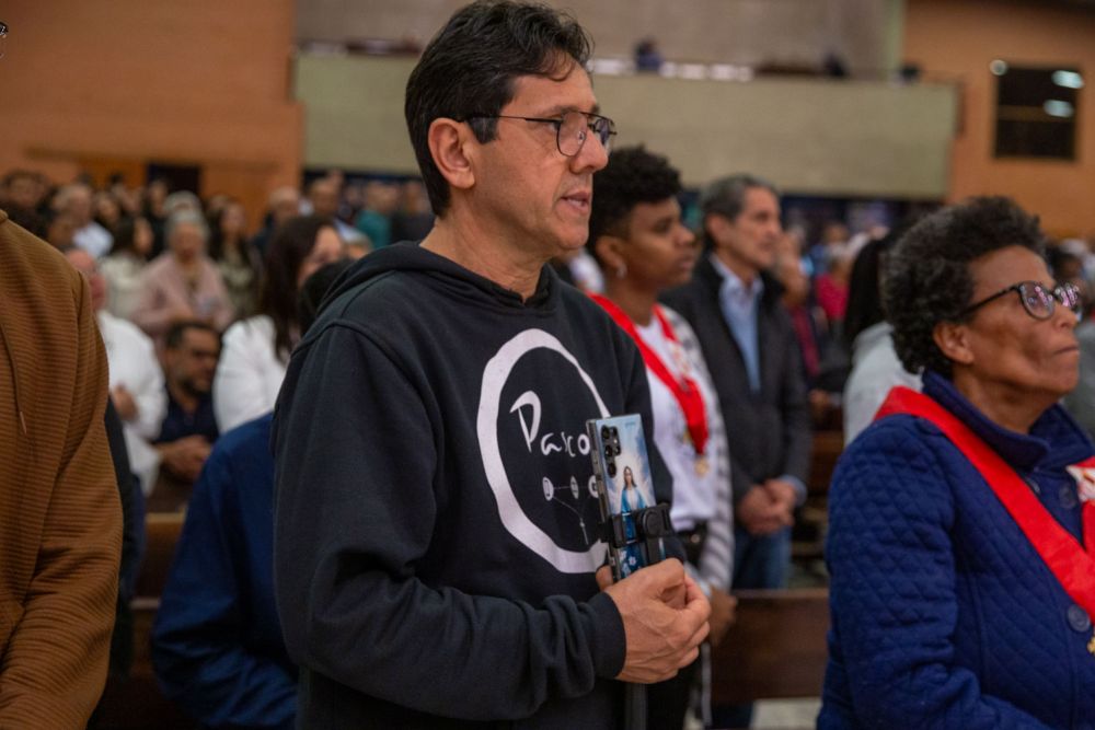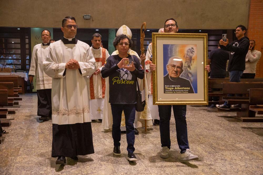 À frente da procissão, um quadro e uma relíquia de primeiro grau do Beato Tiago Alberione foram conduzidos por agentes da Pascom, como sinal de homenagem ao Apóstolo da Comunicação Evangelizadora, cuja espiritualidade inspira a missão de comunicar a fé no mundo contemporâneo e cuja memória também foi celebrada neste dia.