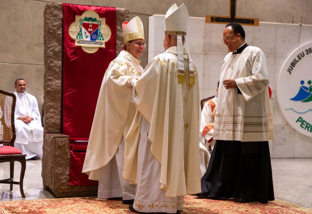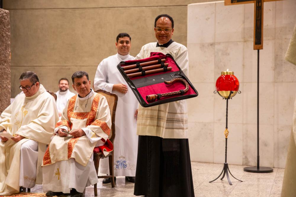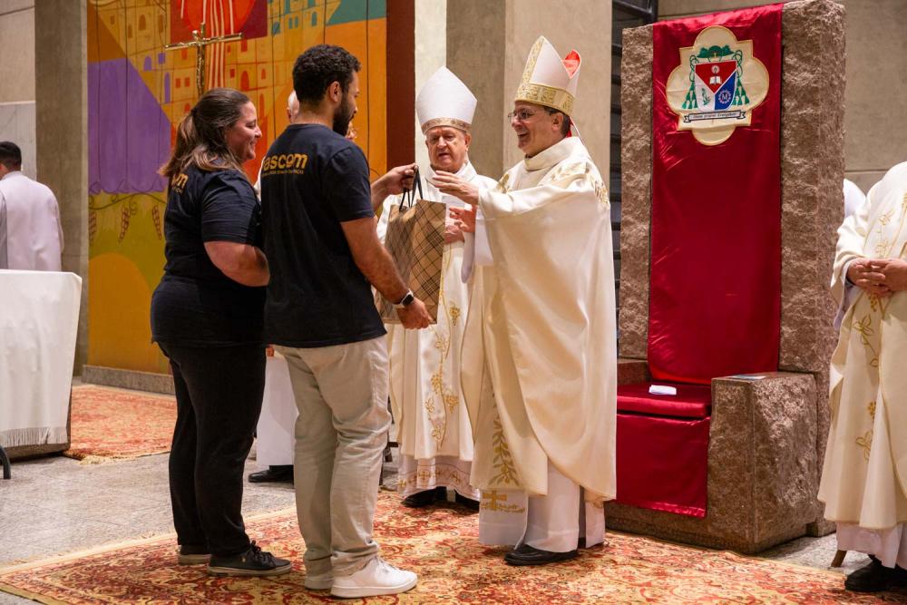 As homenagens se estenderam com palavras do padre Arthur Carvalho de Moraes e culminaram com um gesto simbólico: o bispo emérito, dom Luiz Antônio Guedes, que concelebrou a Eucaristia, entregou um báculo a seu sucessor, sob aplausos de toda a assembleia.