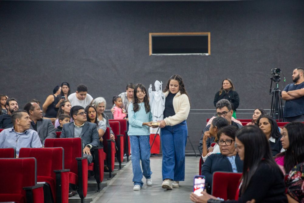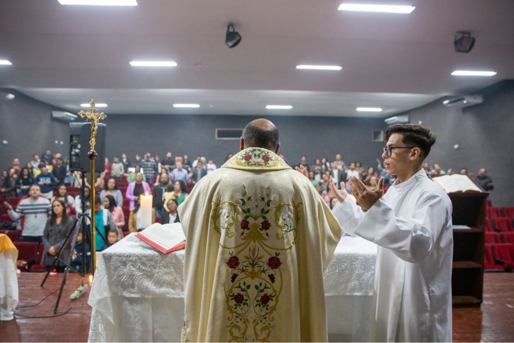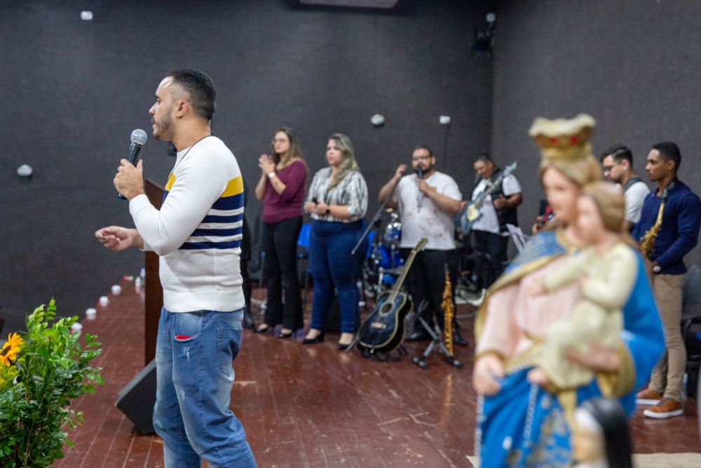 Padre Cesar Silva Rossi, pároco na paróquia Jesus de Nazaré e amigo da comunidade, presidiu a santa missa. Padre César é tão amigo que testemunhou o nascimento da comunidade: “A comunidade completa 20 anos e eu, no final do ano, vou completar 19 anos de ministério. Quando eu conheci a comunidade eu ainda era diácono, éramos mais jovens, eu já estava com a ordenação marcada quando fui convidado pelo fundador, Huanderson, para ter um primeiro contato com a comunidade. Me recordo que a reunião estava acontecendo em uma sala na paróquia Catedral, tinham muitos jovens animados. E por uma providência divina, o laço se estreitou e já colecionamos muitas histórias desde então”.
