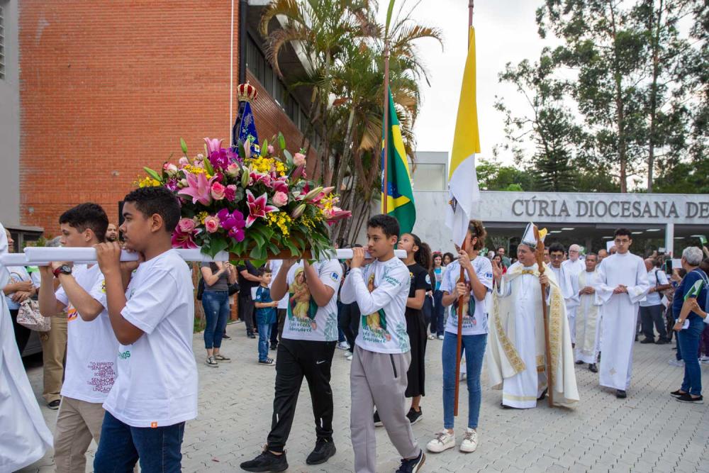 A Santa Missa foi presidida por dom Valdir José de Castro, bispo diocesano, e teve início no pátio central da Catedral, em frente à Cúria Diocesana. As crianças participaram ativamente de toda a celebração, especialmente na liturgia, e foram protagonistas na procissão com o andor de Nossa Senhora Aparecida, conduzindo com entusiasmo, cantos e orações a imagem de Maria para dentro da Catedral.
