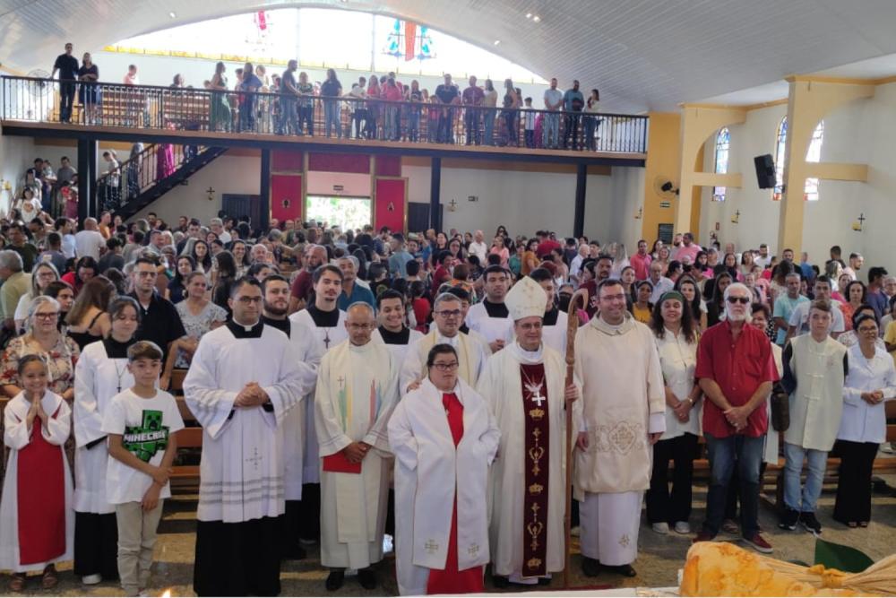 A missa de encerramento da Visita Pastoral à paróquia Santa Clara aconteceu na comunidade matriz no sábado, 25 de maio, às 19 horas. Celebrando a liturgia da Santíssima Trindade, o bispo enfatizou a importância de não apenas expressar a Santíssima Trindade com o sinal da cruz, feito às vezes de forma automática, mas entendendo o significado trinitário, que é uma comunidade de amor.