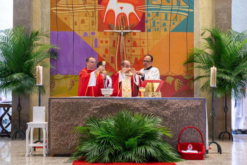 Após a acolhida e bênção dos ramos, cerca de mil e quinhentas pessoas seguiram em procissão até a Catedral Sagrada Família, animadas por cantos. A celebração da Eucaristia teve início às 10h e foi transmitida ao vivo pelas redes sociais da Diocese, alcançando também muitos fiéis que acompanharam de casa este momento tão especial.