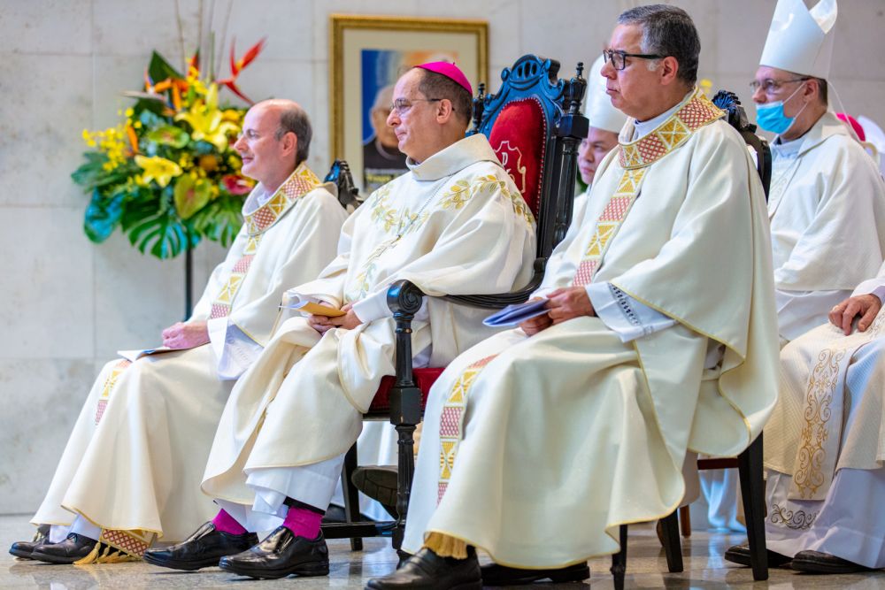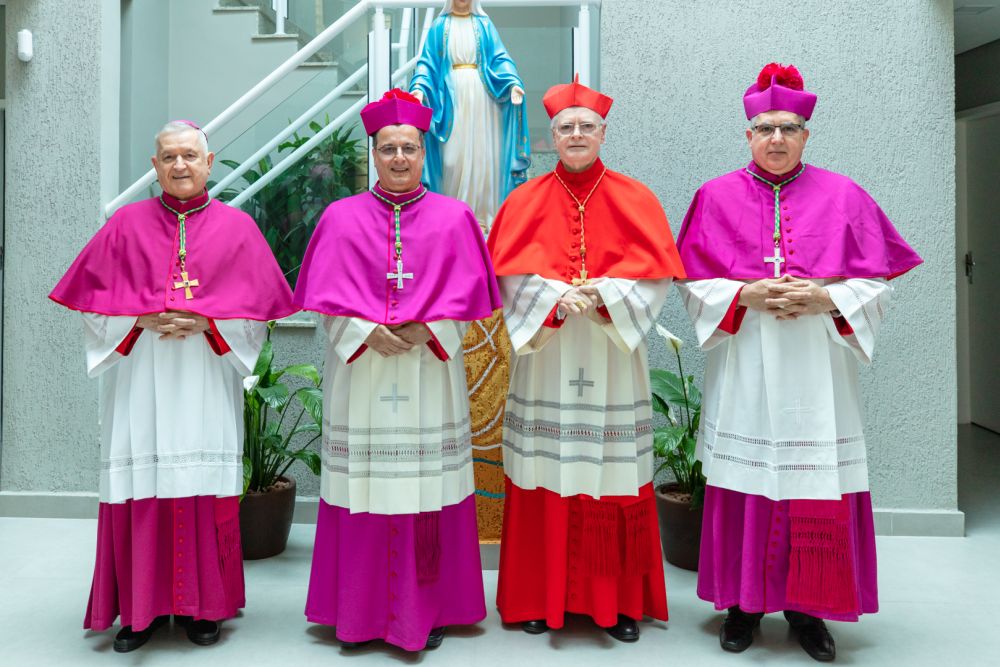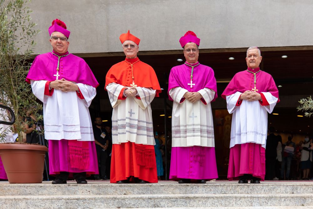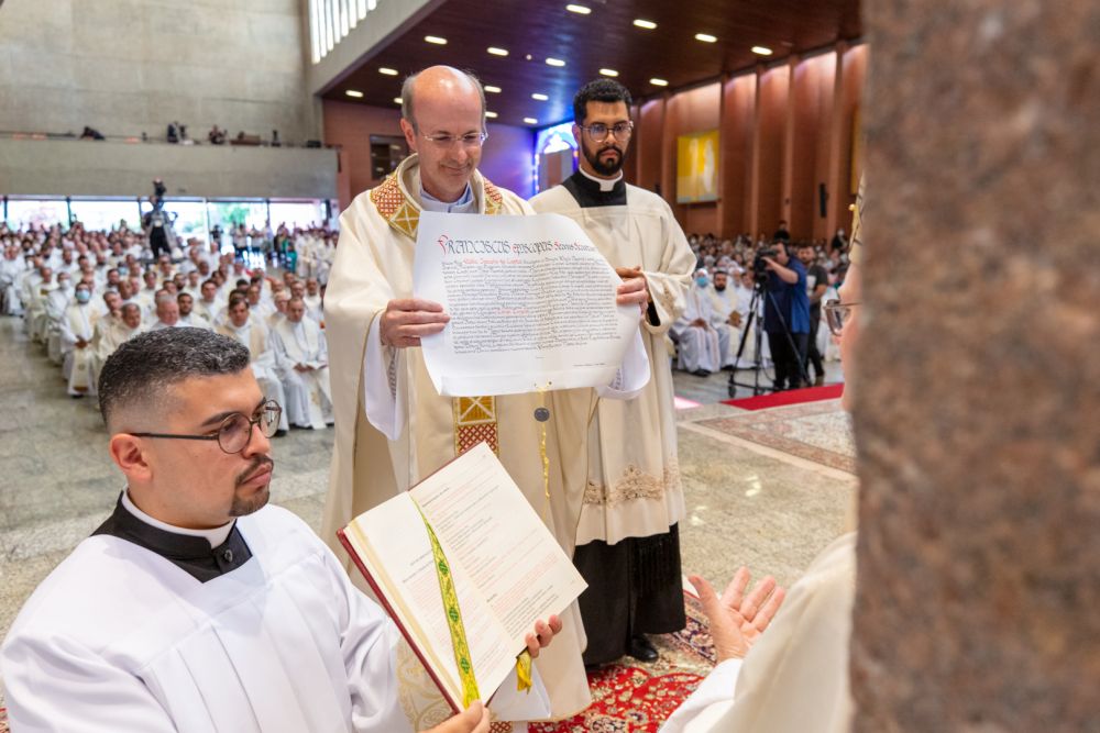 A imposição das mãos, gesto central da ordenação, foi realizada pelos ordenantes, mas também pelos 17 bispos presentes, entre eles Dom Fernando Legal, bispo emérito de São Miguel Paulista, que está com 90 anos.