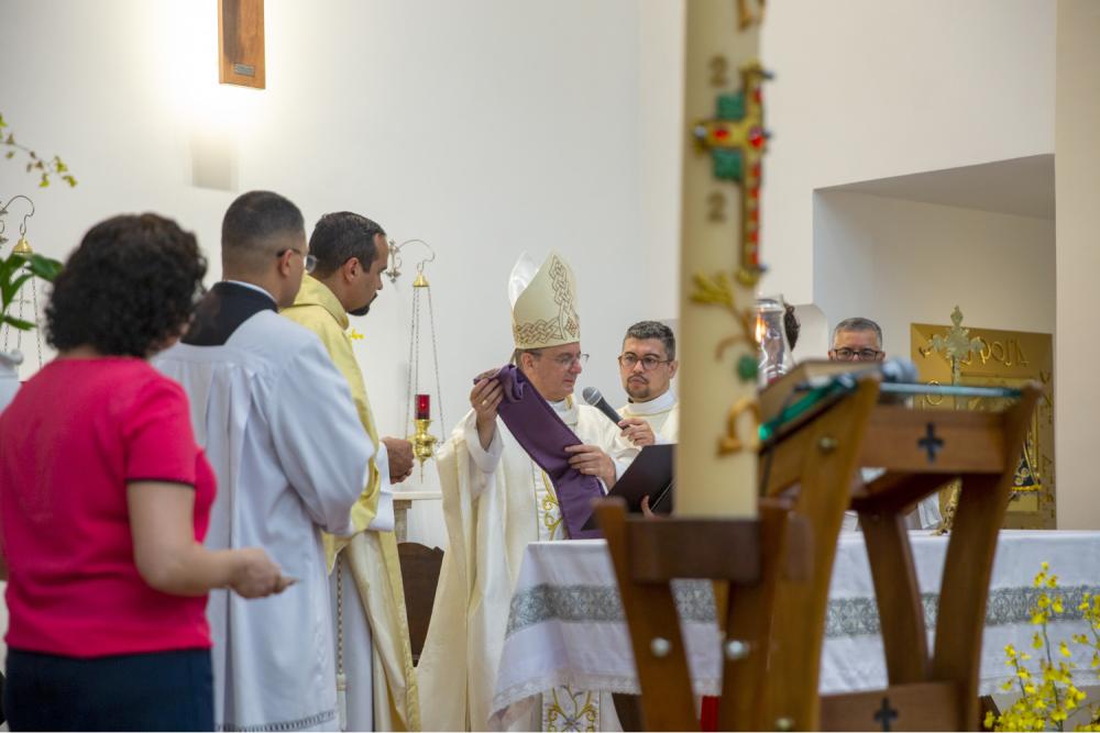 Padre Manoel fez a leitura do decreto de nomeação, seguido pelo juramento de fidelidade do padre Gilberto diante do bispo e da comunidade paroquial. Durante a proclamação do Evangelho, o novo pároco recebeu das mãos do bispo o Evangeliário, simbolizando sua responsabilidade de anunciar a Palavra.