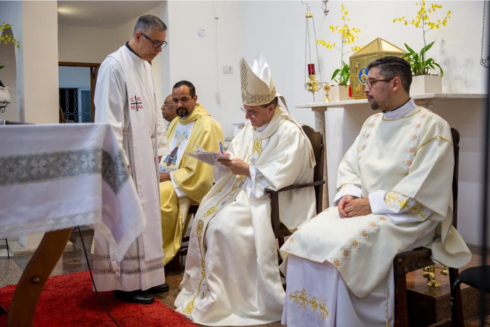 Após a homilia, Dom Valdir entregou as chaves da Igreja e a sédia presidencial ao padre Gilberto, que fez uma breve adoração ao Santíssimo Sacramento. Em seguida, recebeu os objetos do batismo e a estola roxa para o Sacramento da Reconciliação. A comunidade acompanhou atentamente esses ritos, culminando na declaração de posse do padre Gilberto pelo bispo.