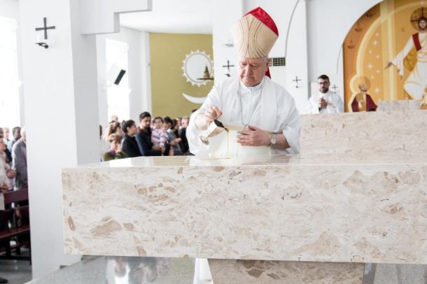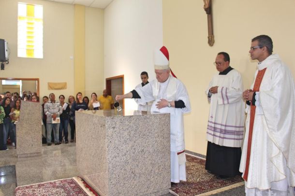 Depois da homilia, teve início o rito de dedicação. Dom Luiz ungiu o altar com o Santo Óleo do Crisma e, em seguida, com a ajuda dos padres presentes, houve a unção das doze cruzes que estão nos pilares por toda a extensão da igreja, e que simbolizam os doze apóstolos, significando também que o templo é dedicado exclusivamente e para sempre ao culto cristão.