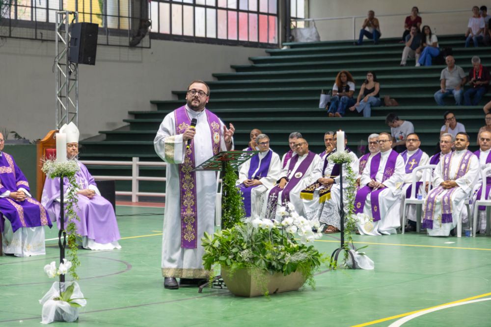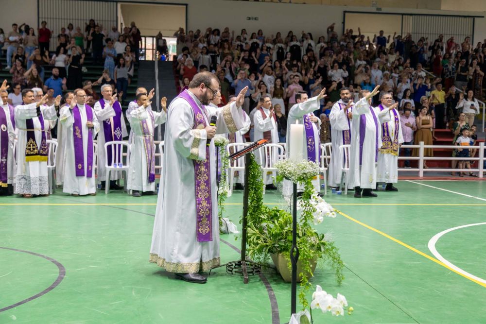 Antes da celebração eucarística, presidida às 16h pelo bispo diocesano Dom Valdir José de Castro, a assembleia viveu um momento de profunda espiritualidade mariana. A oração do Santo Terço foi conduzida por rostos que contam a própria história do ministério do homenageado: casais por ele acompanhados no sacramento do matrimônio; crianças, hoje já adultas, que receberam o batismo por suas mãos; jovens que caminhou na preparação para a primeira comunhão. Cada mistério rezado parecia devolver à memória um trecho do pastoreio vivido com fidelidade ao longo de 25 anos.
