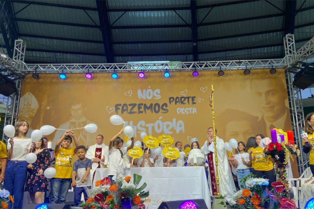 No momento pós comunhão, mais uma homenagem foi prestada. Enquanto Camila Perrucini e Cris Soares cantavam, as crianças da catequese entraram, trazendo plaquinhas com a arte do Louvor de 45 anos de sacerdócio do Padre Alberto Gambarini. Todo o ginásio levantou bexigas e bandeirinhas, em homenagem ao aniversariante.