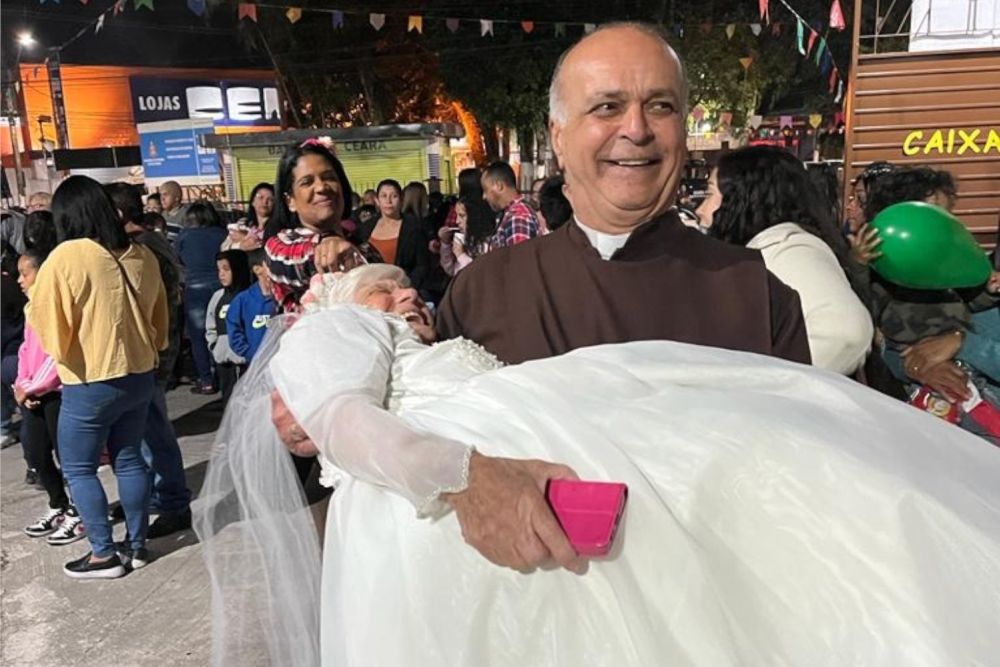 Em clima de alegria, acolhida e desconcentração o pároco, padre José Lúcio Emer, percorreu o pátio da igreja com a noiva nos braços no meio do povo chamando bastante atenção de todos.