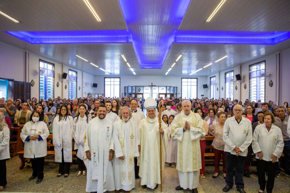 A paróquia esteve repleta de fieis e na procissão de entrada um andor com a imagem ornamentada de Nossa Senhora precedeu o celebrante e os demais. Padre Darci, acolheu Dom Valdir, “Seja bem vindo Dom Valdir, aqui está parte do seu povo desta paróquia, a casa é sua”, e toda a assembléia o recebeu com uma calorosa salva de palmas.