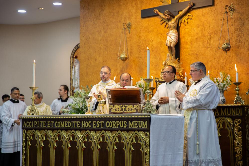 Em seguida, teve início o rito de dedicação. O altar foi ungido com o Santo Crisma e as doze cruzes espalhadas pelo templo também receberam a unção, em sinal de que aquele espaço é consagrado para sempre ao culto cristão. O bispo incensou o altar, gesto que simboliza a entrega de Cristo e as orações do povo que sobem a Deus, e o revestimento do altar, seguido da iluminação da Igreja, recordou à comunidade que Cristo é a luz que se revela às nações. O decreto de dedicação foi lido e assinado por dom Valdir, pelo pároco e pelo padre Alessandro, e, ao final, todos puderam ver uma placa instalada na entrada principal da igreja com o registro da data deste marco histórico.