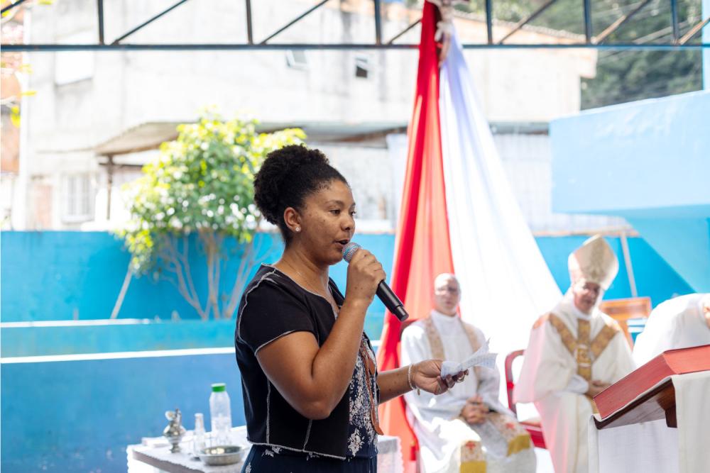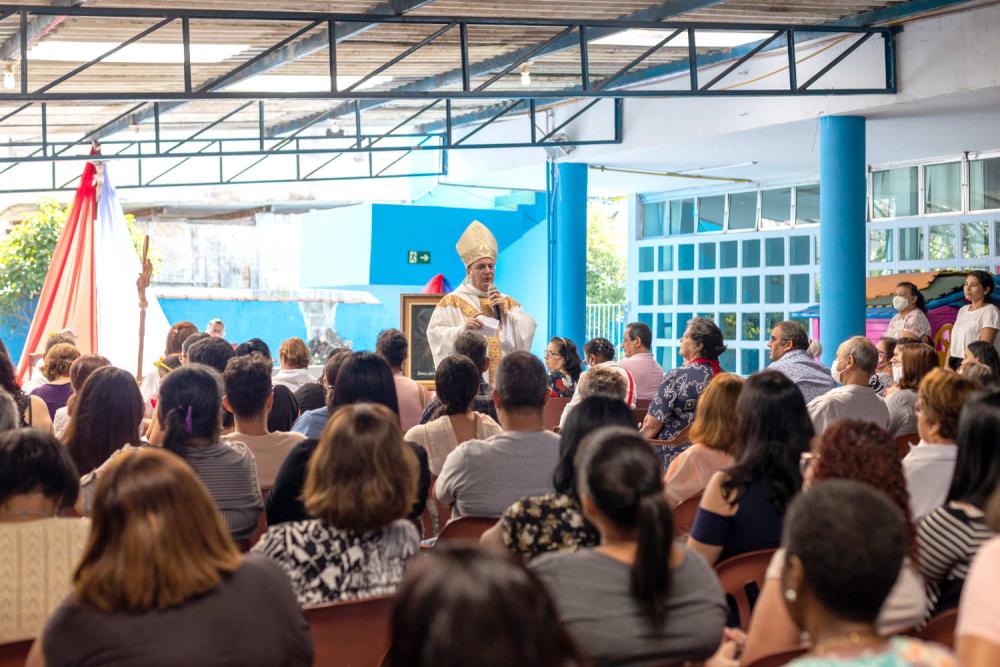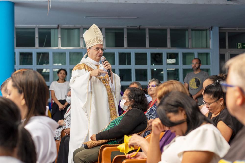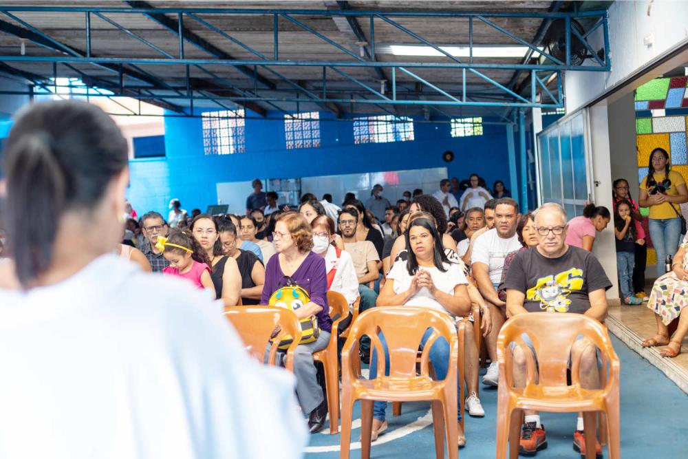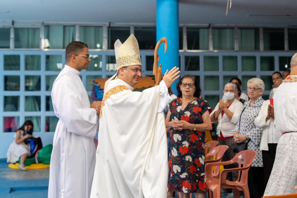 O momento de acolhida começou com o encontro da comunidade e o Bispo antes do início da celebração, muitas pessoas tiveram a oportunidade de trocar algumas palavras com o bispo e muito aproveitaram para ‘tirar’ uma selfie. A comunidade, que funciona em uma escola foi toda preparada para receber o grande número de fiéis e o bispo diocesano, que visitou a paróquia pela primeira vez.