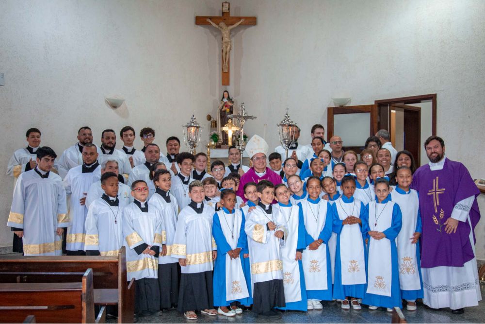 Durante a procissão de entrada, um grupo de crianças acolheu calorosamente Dom Valdir, dando-lhe as boas-vindas à paróquia, com grande entusiasmo.