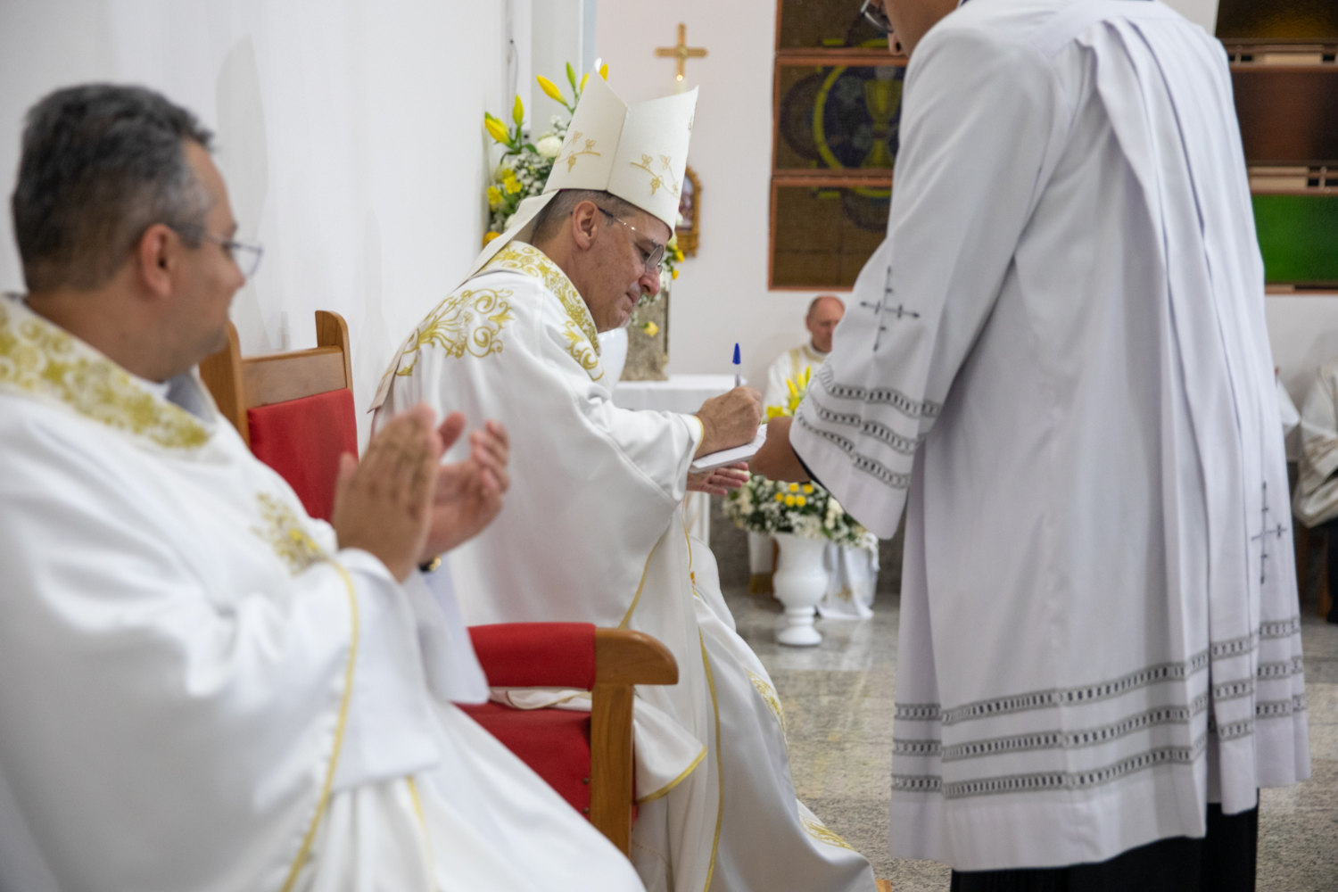 Em seguida, ocorreu a incensação do altar, representando o sacrifício de Cristo e simbolizando que as orações da Igreja e dos fiéis chegam a Deus. O altar foi então revestido, indicando que aquele espaço é tanto altar do sacrifício quanto a mesa do Senhor, onde se celebra a morte e ressurreição de Cristo. Por fim, a iluminação da igreja foi restabelecida, recordando que Cristo é a “Luz a se revelar às nações”.