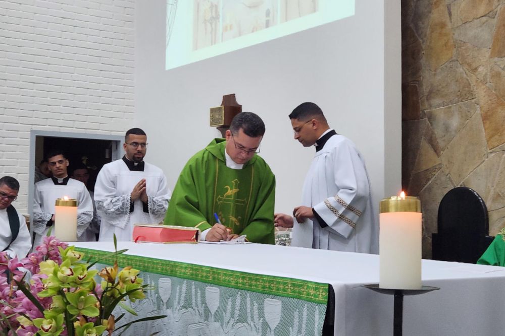 Após a acolhida inicial, padre Antônio fez o Juramento de Fidelidade, assumindo publicamente o compromisso de servir à Igreja em comunhão com seu bispo. Em seguida, Dom Valdir entregou-lhe o Evangelho antes da proclamação, lembrando a missão essencial de todo sacerdote: “Recebe o Evangelho de Cristo, do qual foste constituído mensageiro. Transforma em fé o que lês, ensina o que crês e procura realizar o que ensinas”.