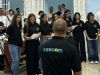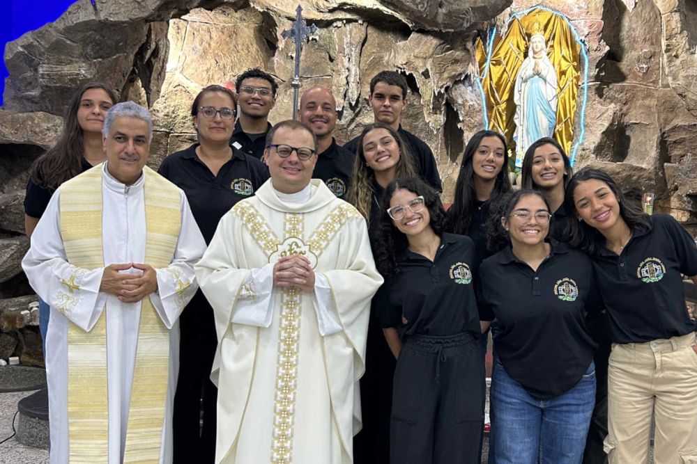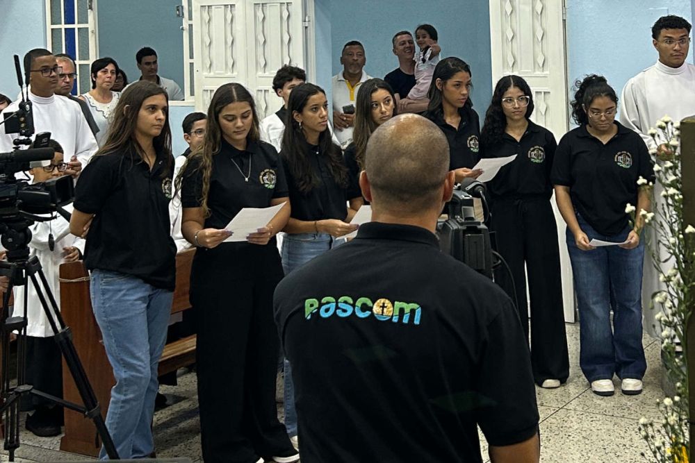 Antes da bênção final, os agentes da Pascom foram chamados ao presbitério para um momento de diálogo e bênção. O grupo, formado por Igor, Juciléa, Luiza Carvalho, Luiza Xavier, Marina, Laura, Julia, Sofia, Giovanna, Arthur e João, foi convidado a reafirmar seu compromisso de evangelizar pelos meios de comunicação. Padre Rodrigo os abençoou, assim como seus instrumentos de trabalho, e os incentivou: “Ide por todo o mundo e pregai o Evangelho”.