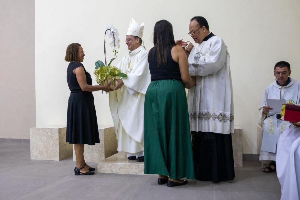 Outro momento marcante foi a incensação do altar, representando o sacrifício de Cristo e o simbolismo de que as orações dos fiéis sobem a Deus como suave perfume. O altar foi revestido, simbolizando sua função como mesa do Senhor e local de celebração da Eucaristia. Por fim, as velas acesas e a iluminação completa do templo destacaram a mensagem de Cristo como “Luz para as nações”.