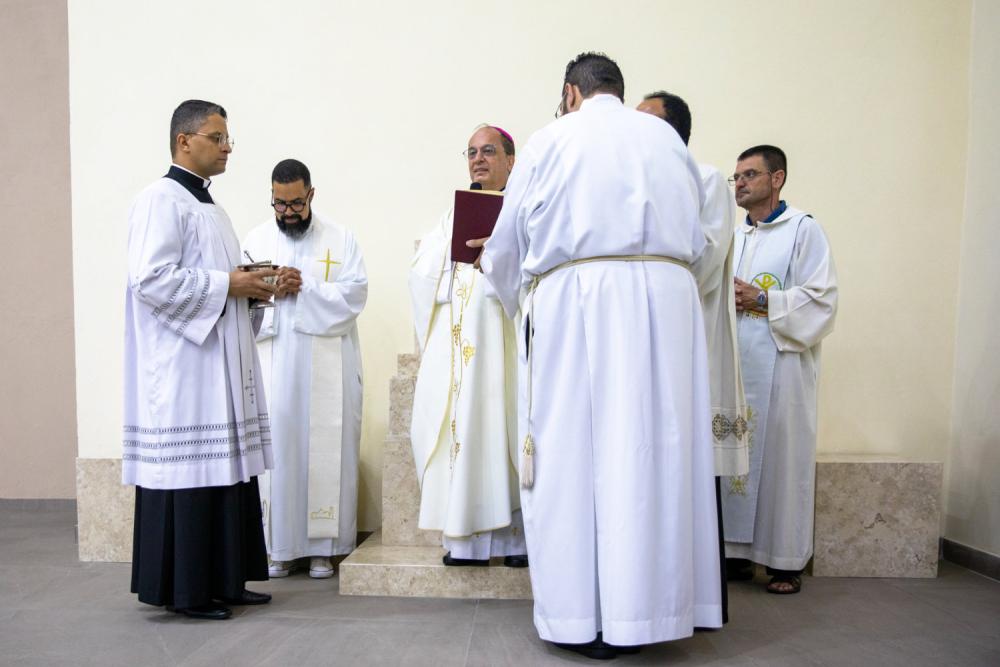 O altar foi ungido com Santo Crisma, marcando sua consagração exclusiva para o culto cristão. As cruzes fixadas nas paredes também foram ungidas, significando que o templo é dedicado permanentemente às celebrações litúrgicas. O padre Duccio participou ativamente deste momento ao auxiliar na unção.