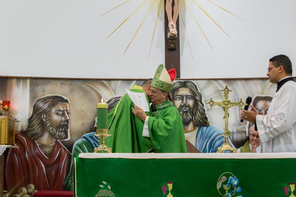 Após a homilia, o rito de posse teve sequência. O novo pároco fez a profissão de fé, renovou as promessas sacerdotais e recebeu símbolos próprios de sua missão: os livros de registros dos sacramentos e da administração, a estola, os sinais do Batismo e as chaves do Sacrário, diante do qual permaneceu em adoração por alguns instantes. Recebeu também a sédia, símbolo do serviço pastoral de guiar e conduzir o povo de Deus.