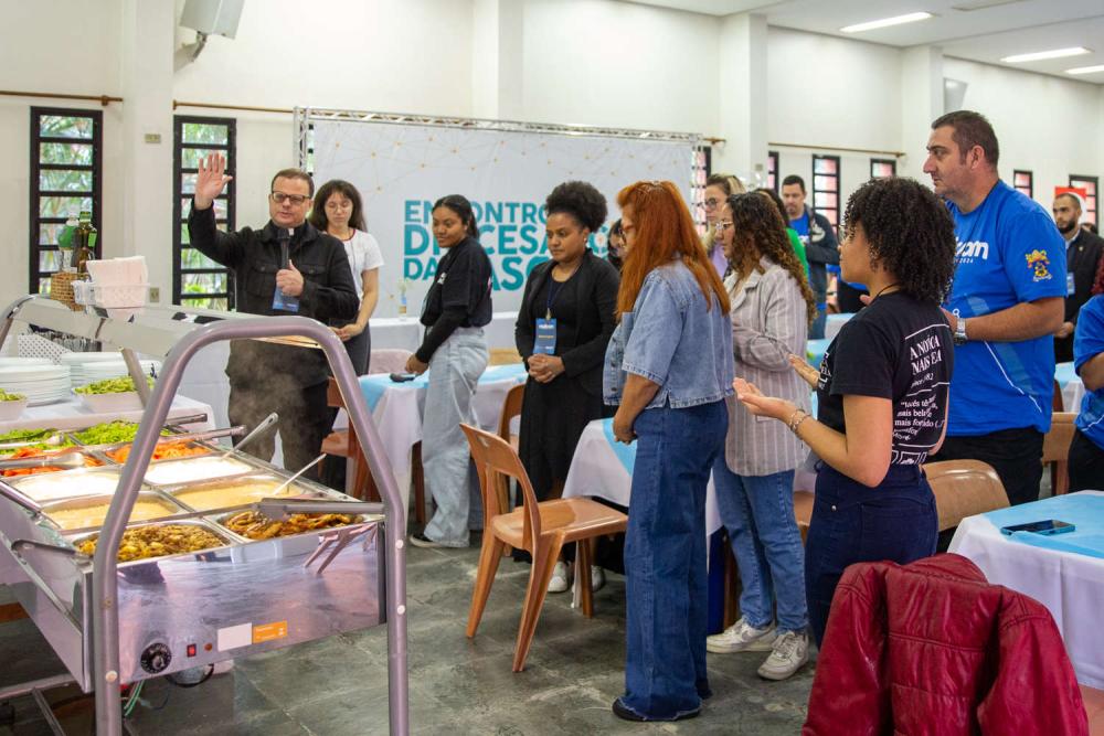 Mesmo sob uma chuva intensa, o espírito de comunhão entre os participantes se manteve durante o almoço, proporcionando um momento de troca de experiências entre os agentes de diferentes paróquias. À tarde, os louvores do cantor Milton Fortes animaram o retorno às atividades.