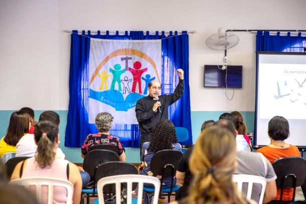 A pedagoga Cinthia Correia, da equipe do Ensino Religioso, além de animar os cantos da missa, com a ajuda do Lucas, também do Ensino Religioso, e do Mateus, da Pastoral Universitária, partilhou lições importantes que aprendeu nos seus 32 anos de professora e também formadora de educadores. Realizou dinâmicas de roda com sugestões muito enriquecedoras no processo educativo que promovem o entrosamento dos alunos entre si e alunos com o educador e vice-versa, ressaltando a importância de olhar para cada educando, estar atento à suas necessidades e individualidade.