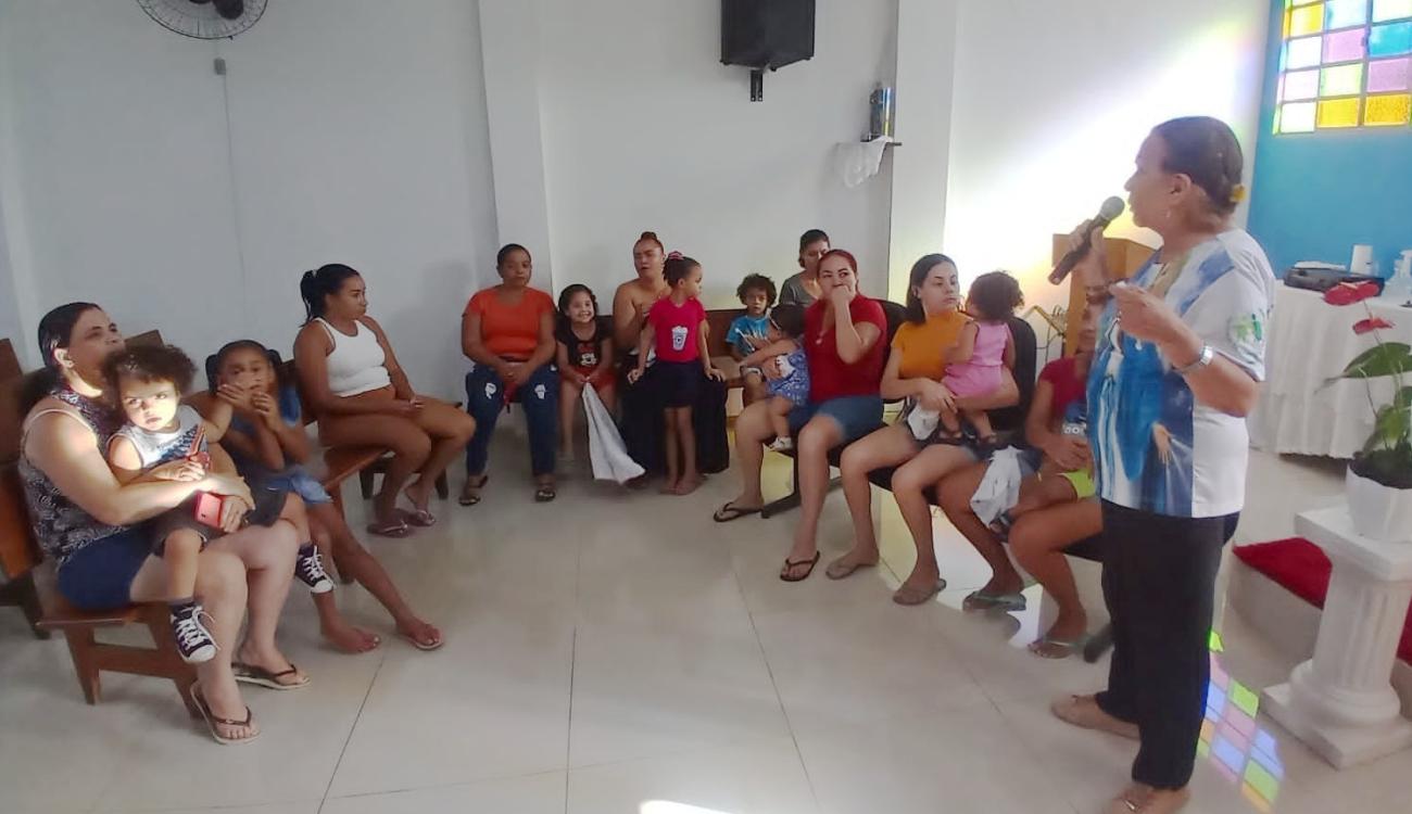 A Pastoral da Criança, que realiza essas ações mensalmente há 20 anos, recebeu um grupo de mães e seus filhos, oferecendo orientações de saúde, distribuindo medidores de soro caseiro e sulfato ferroso. Em seguida, houve um diálogo sobre a relação entre fé e vida, as políticas públicas de saúde e a importância do voto para garantir direitos, envolvendo todos os participantes. Antes do encerramento da reunião, a Pastoral da Criança distribuiu cestas básicas e foi realizado um lanche coletivo.