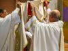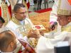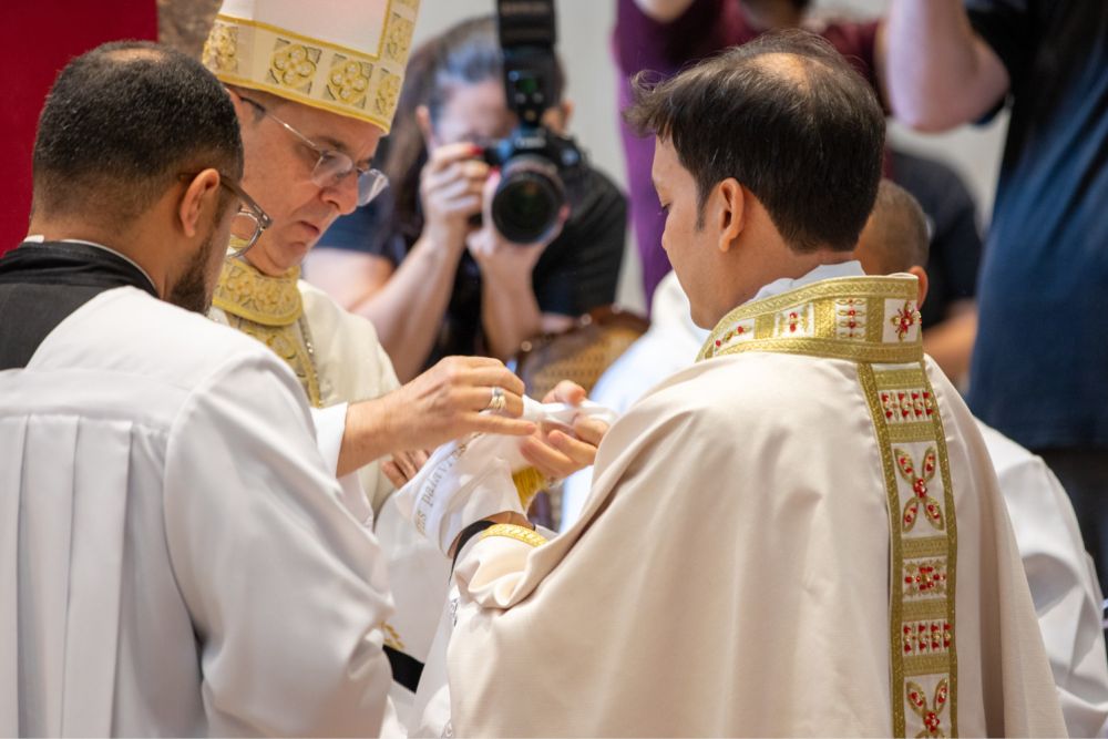 No momento seguinte, foram revestidos com a estola sacerdotal e a casula. Em seguida, de joelhos, tiveram suas mãos ungidas pelo bispo com o óleo do Santo Crisma. Logo após, o bispo atou as mãos dos ordenados, sendo desatadas por quem iria receber a primeira bênção sacerdotal. Os quatro, já ordenados, deram a primeira bênção como sacerdotes aos seus pais.