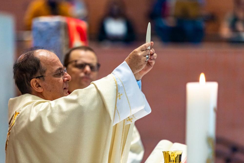 Em sua homilia Dom Valdir falou sobre alguns aspectos, dos muitos que poderiam ser citados sobre a Eucaristia: “primeiro a Eucaristia é mistério da fé, e não significa que não seja possível entender nada sobre a Eucaristia, mas é um mistério onde é preciso ter fé. Quem não tem fé não consegue celebrar a Eucaristia ou adorar o Santíssimo Sacramento. A Eucaristia, é também alimento. Assim como é preciso nutrir o corpo, precisamos nutrir a alma, com a Eucaristia e com a Palavra. Um terceiro ponto é que a Eucaristia é a presença de Jesus no meio de nós, que também se faz presente no irmão, na irmã, nos necessitados de alimento, mas também, de atenção, e claro, a Eucaristia nos leva ao compromisso cristão. Somos um só corpo como comunidade, como assembleia, como Igreja, a Eucaristia nos convoca a viver a fraternidade, raiz a nossa comunhão”.