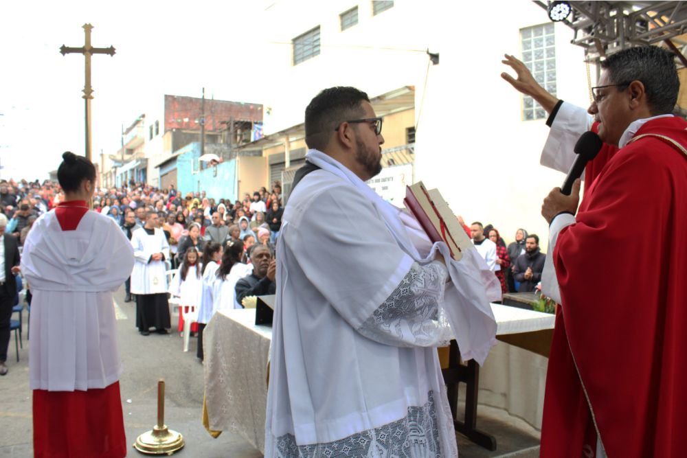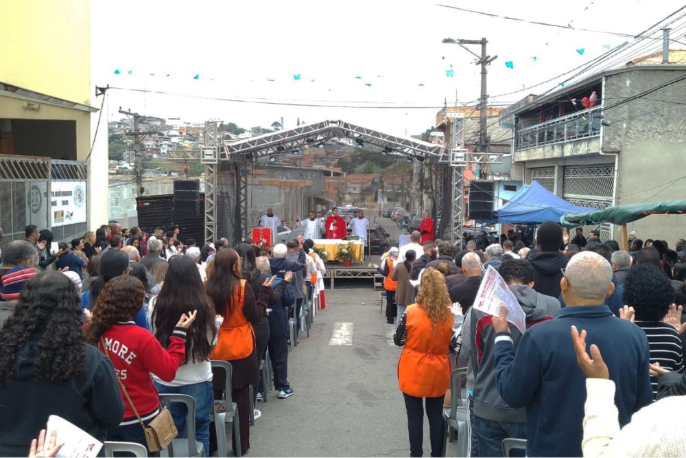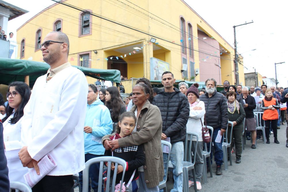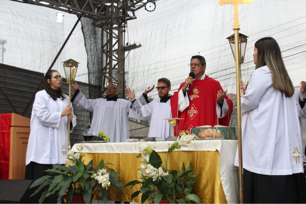A missa solene do aniversário da paróquia foi celebrada na rua, com o palco da festa junina, que ocorre durante todo o mês de junho, tradicionalmente desde quando a comunidade era São Francisco de Assis.